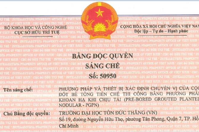 Nhà khoa học Khoa Kỹ thuật Công trình, Trường Đại học Tôn Đức Thắng được cấp Bằng độc quyền sáng chế