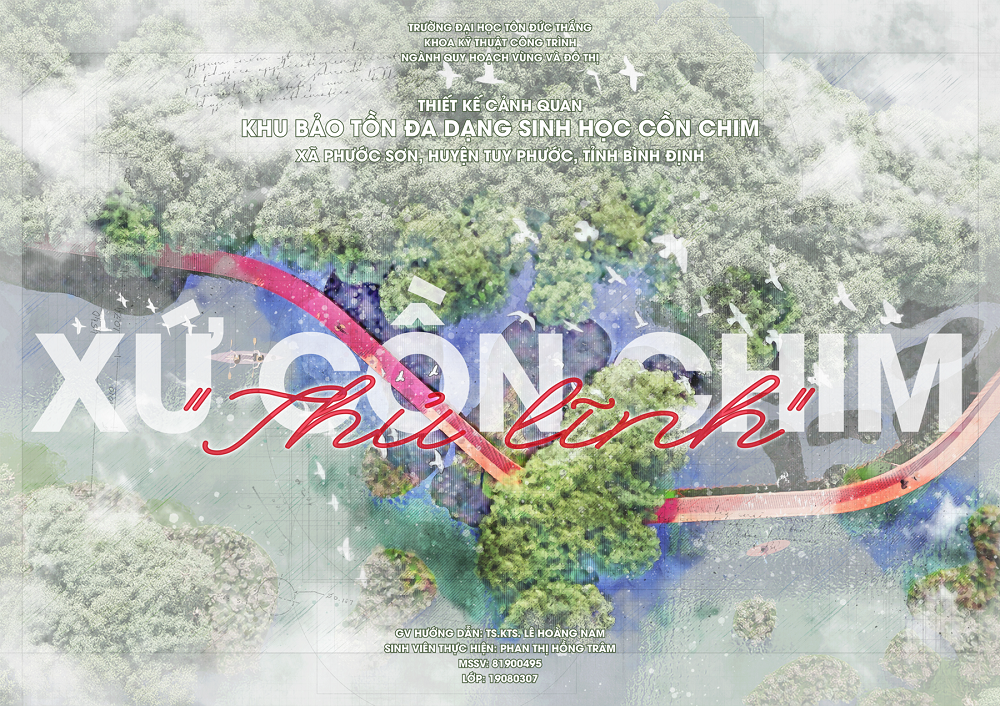 Cồn Chim – vùng đất ngập nước quý giá thuộc đầm Thị Nại (Bình Định) – là nơi sinh sống của hàng trăm loài chim di cư, đồng thời đang chịu nhiều áp lực do khai thác thiếu bền vững. Xuất phát từ thực tiễn đó, đồ án của Trâm được xây dựng với mục tiêu bảo tồn và phục hồi rừng ngập mặn, phát triển sinh kế cộng đồng và hình thành mô hình du lịch sinh thái – giáo dục môi trường gắn với bản sắc địa phương.