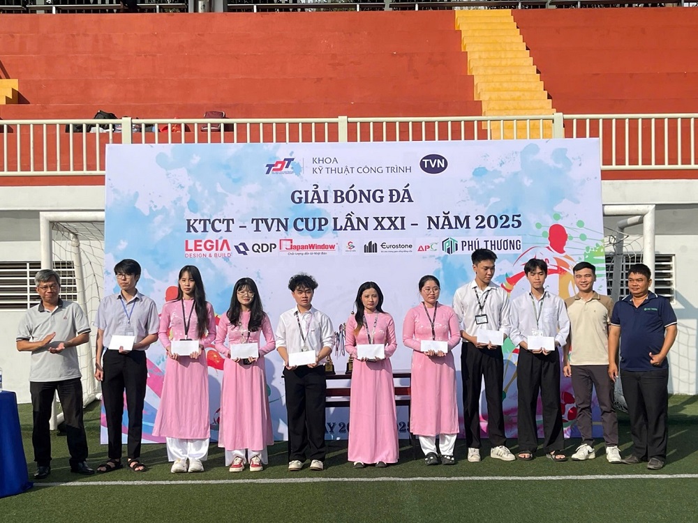 Ngày 20 tháng 12 năm 2025, tại sân vận động trường đại học Tôn Đức Thắng, Khoa Kỹ thuật công trình đã phối hợp với các công ty thân hữu tổ chức giải bóng đá TVN-KTCT Cup lần thứ 21. Đây là một giải đấu thường niên do Khoa Kỹ thuật công trình phối hợp với các doanh nghiệp thân hữu hoạt đông trong lĩnh vực xây dựng tổ chức. Giải đấu đã góp phần tăng cường hiểu biết và gắn kết giữa khoa và các doanh nghiệp, tạo điều kiện để các doanh nghiệp hỗ trợ khoa trong việc tuyển dụng sinh viên tốt nghiệp, giúp đỡ sinh viên của Khoa trong thực tập, kiến tập, trao đổi kinh nghiệm thực tế … Chương trình này đã thể hiện sự hoạt động mạnh mẽ và hiệu quả của Khoa Kỹ thuật công trình trong việc hợp tác gắn kết với các doanh nghiệp.